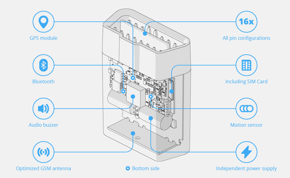 The high-quality motion sensor guarantees a precise recording of the driving behavior and a reliable crash detection. The patented False Alarm Filter enables an efficient Automatic Crash Notification System (ACN) with no false alarms.